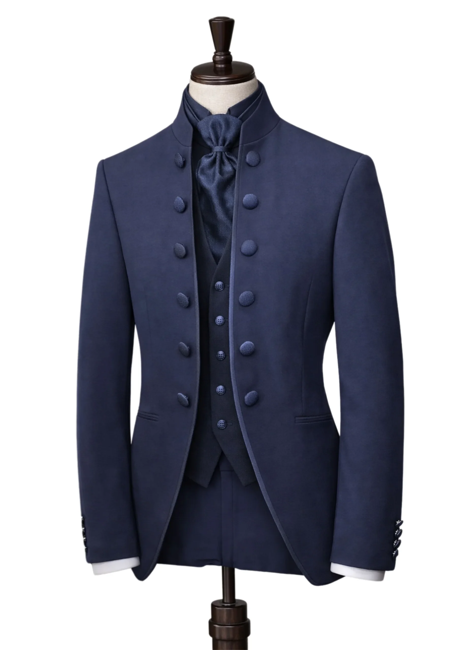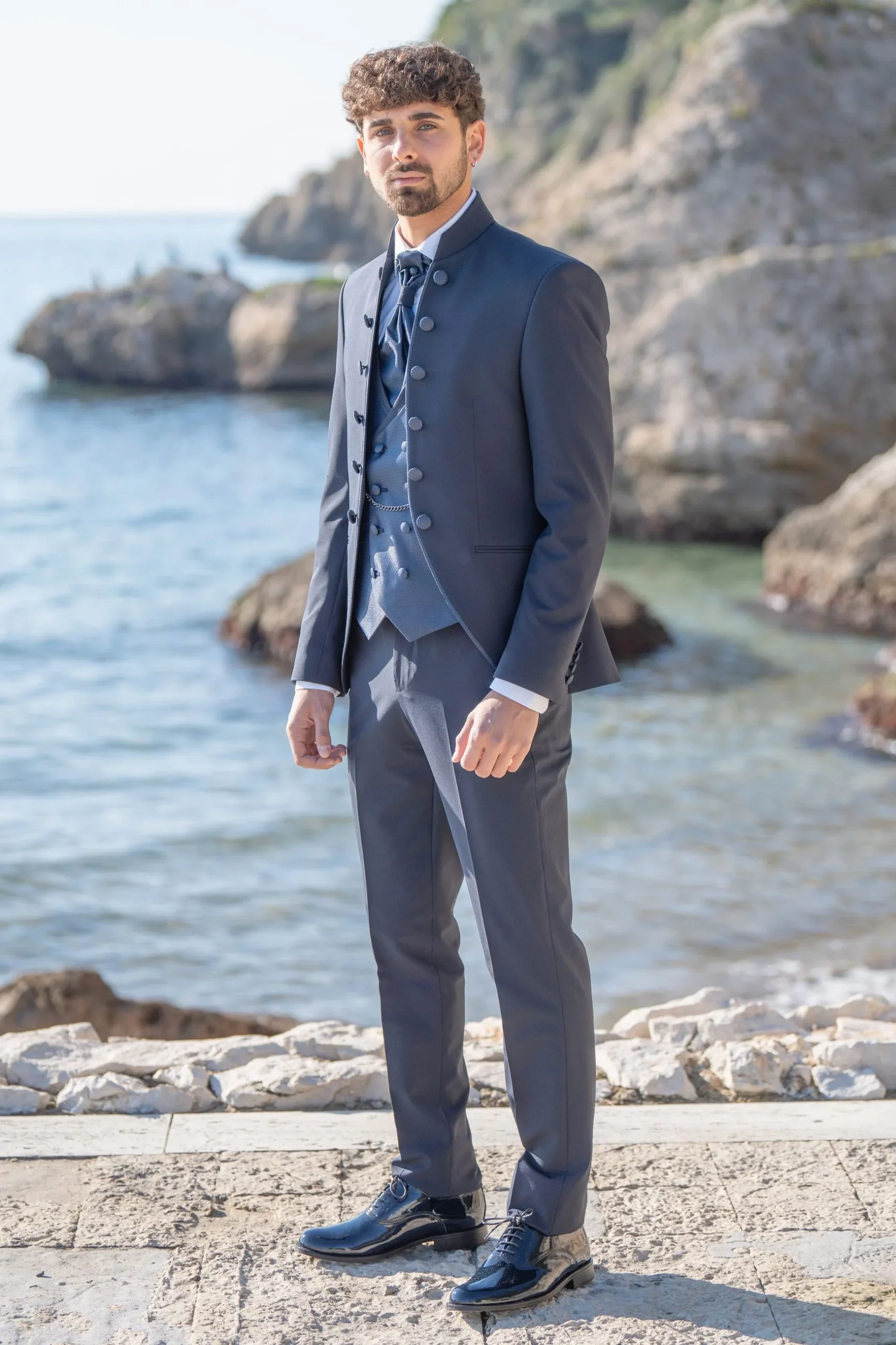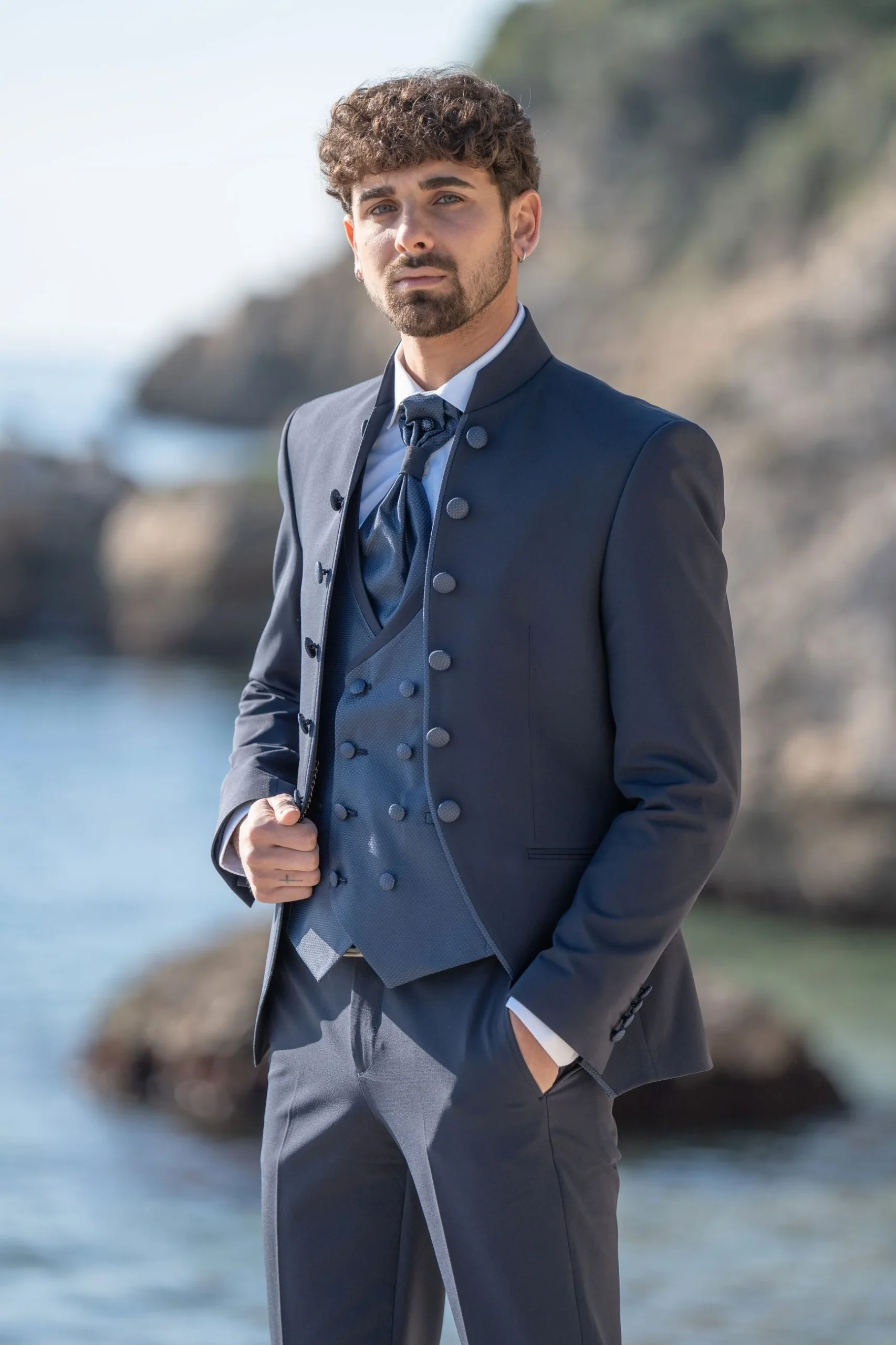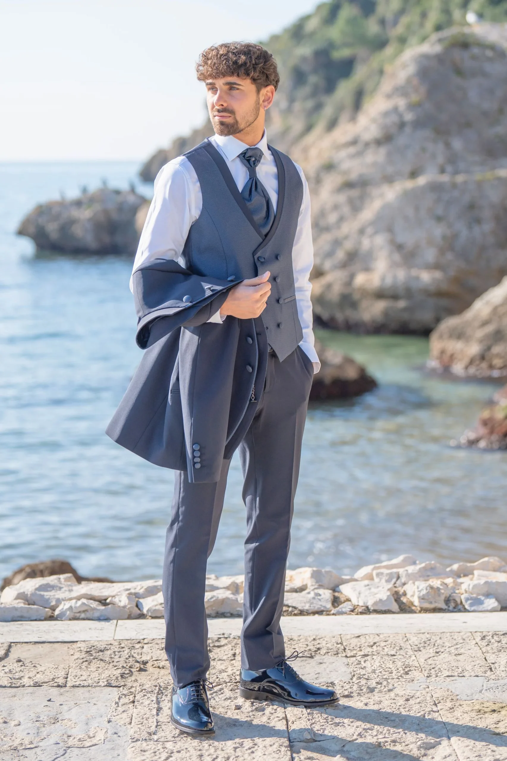 Completo Sposo.Giacca corena con bottoni rivestiti in raso microtramato e profili.Gilet doppio petto in raso microtramato e bottoni rivestiti.Pantalone tinta unita.Cravattone in raso microtramato e spilla.