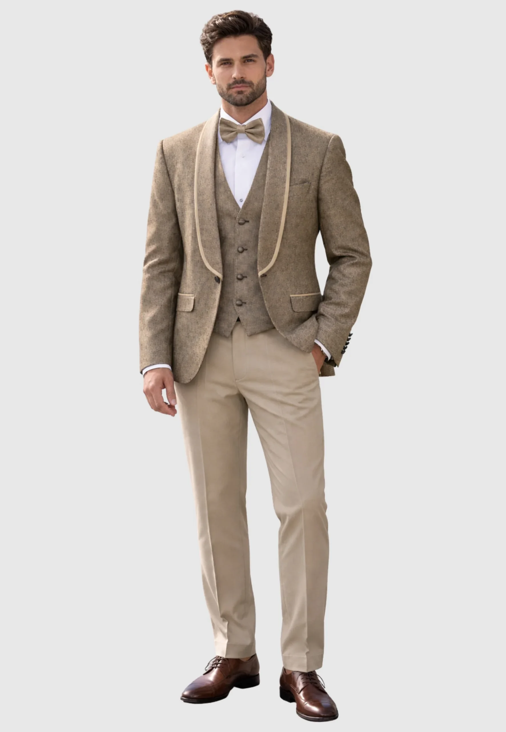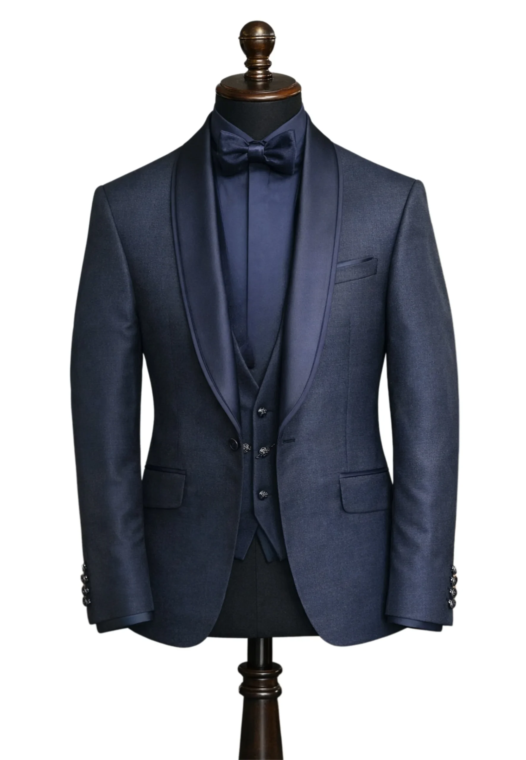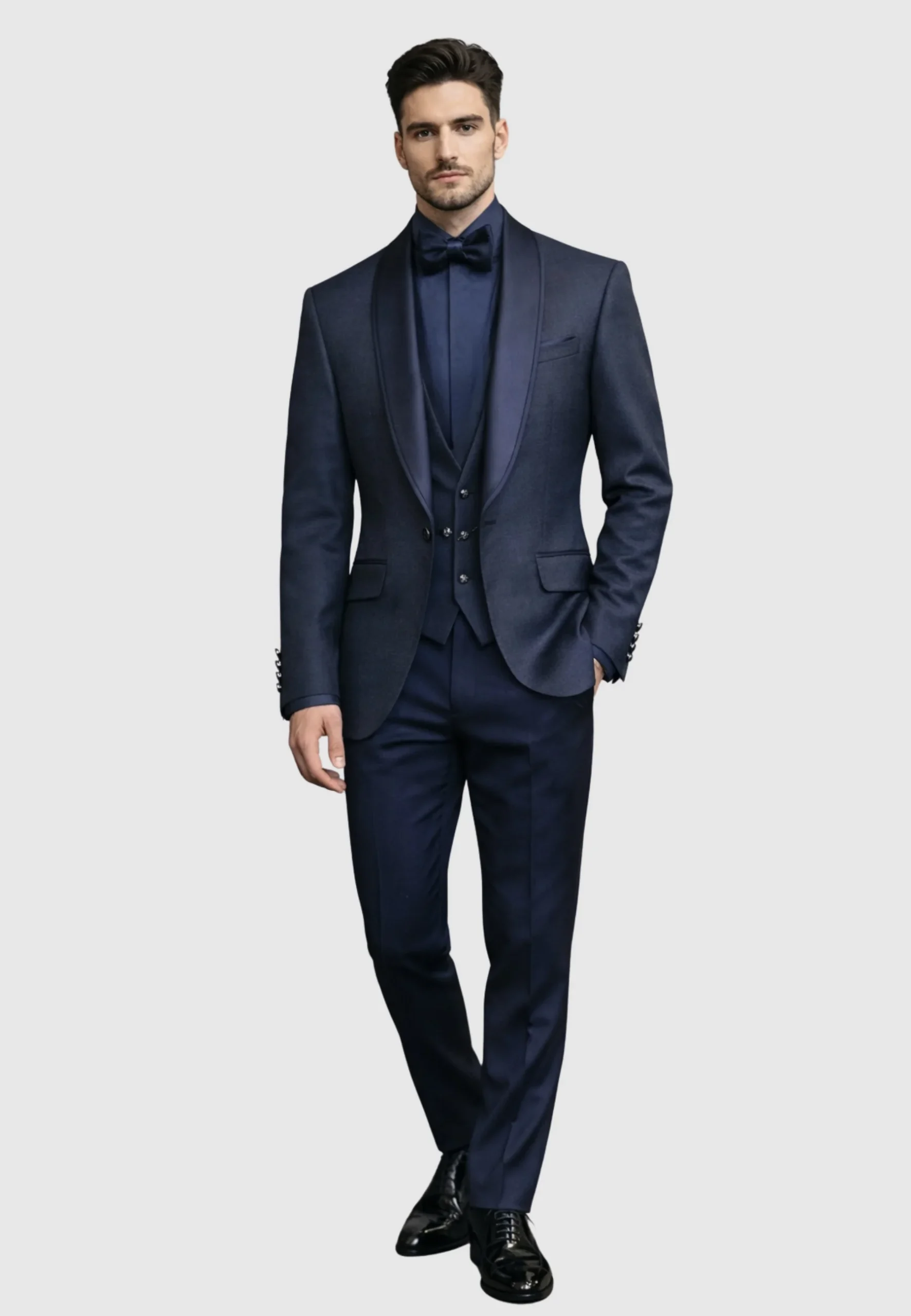 Completo Sposo.Giacca in tessuto satinato con rever sciallato e profili in raso.Gilet doppio petto con bottoni gioiello.Pantalone tinta unita.Papillon.