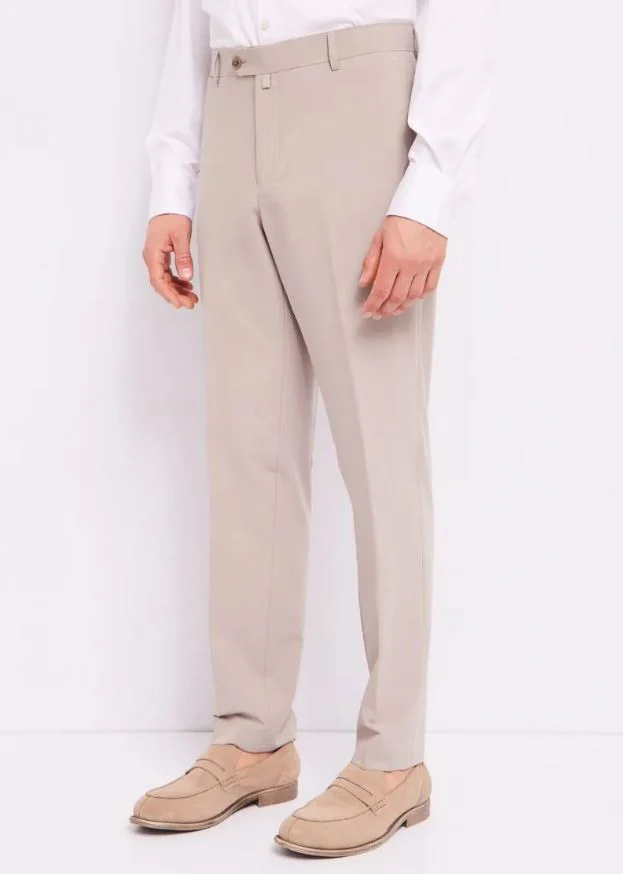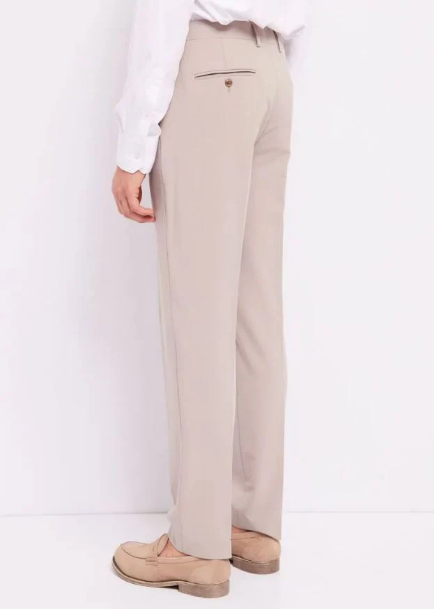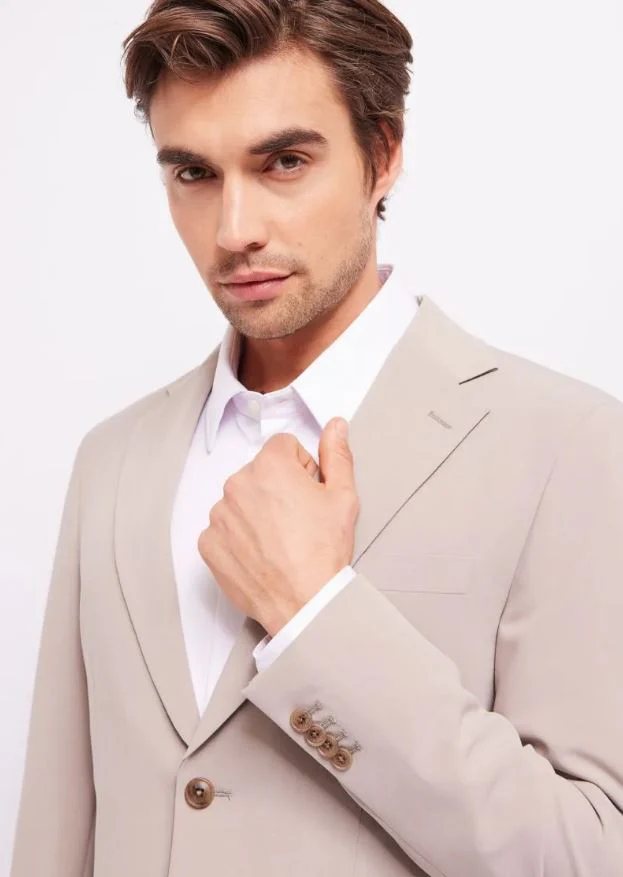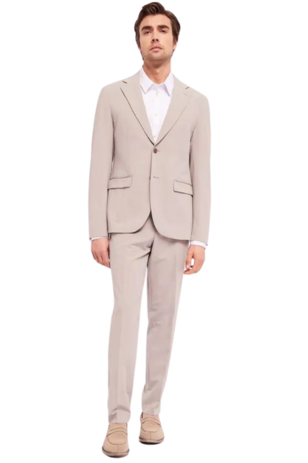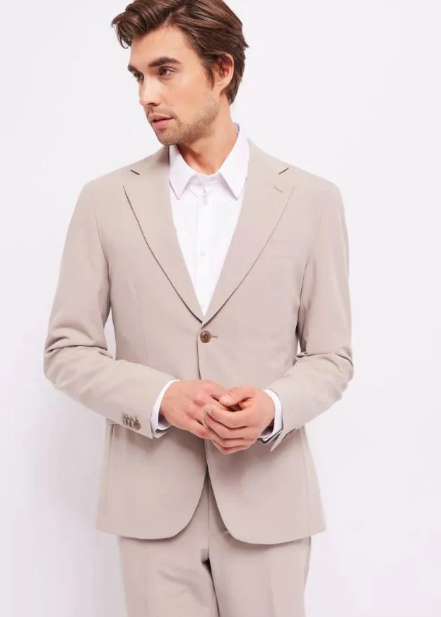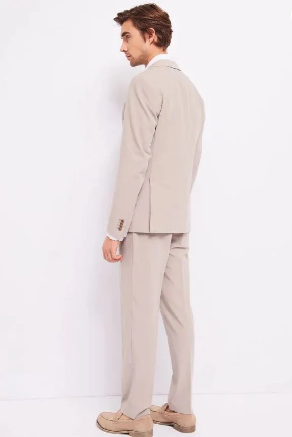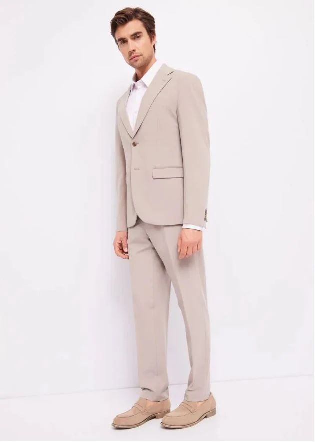 Completo giacca doppio petto a due bottoni, pantalone taglio classico e vita normale, vestibilità slim.