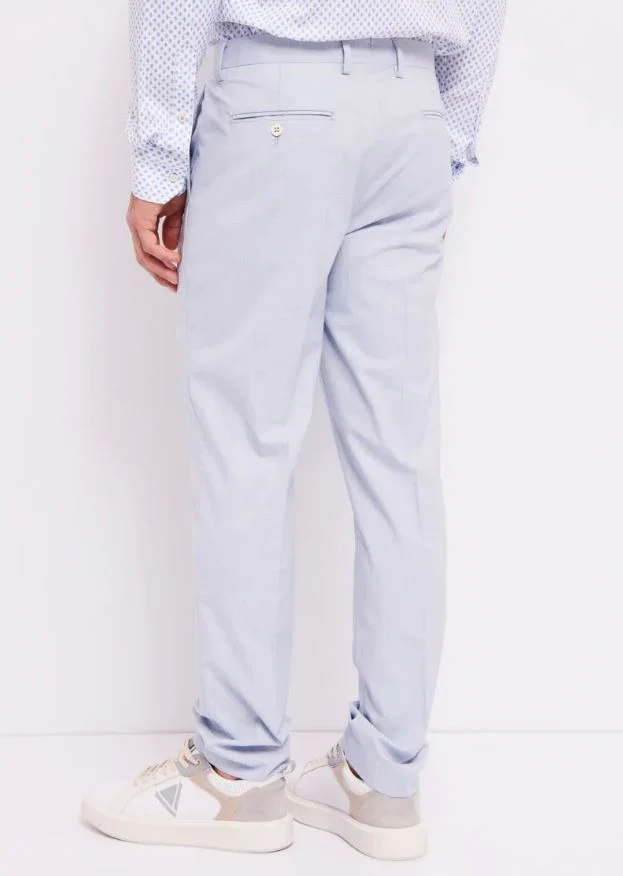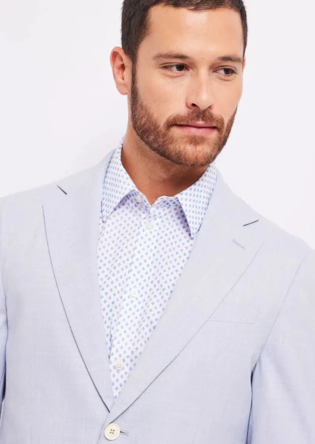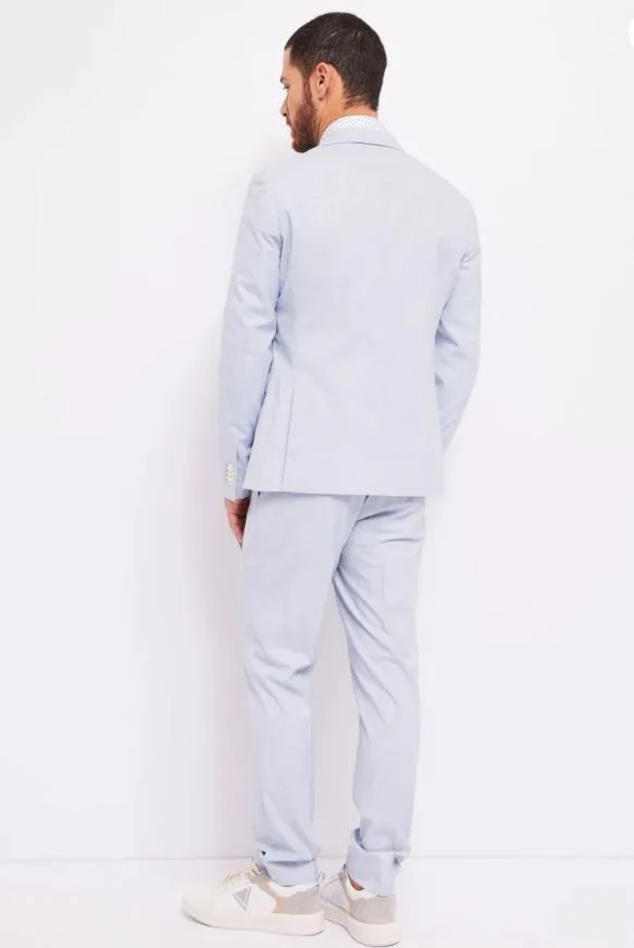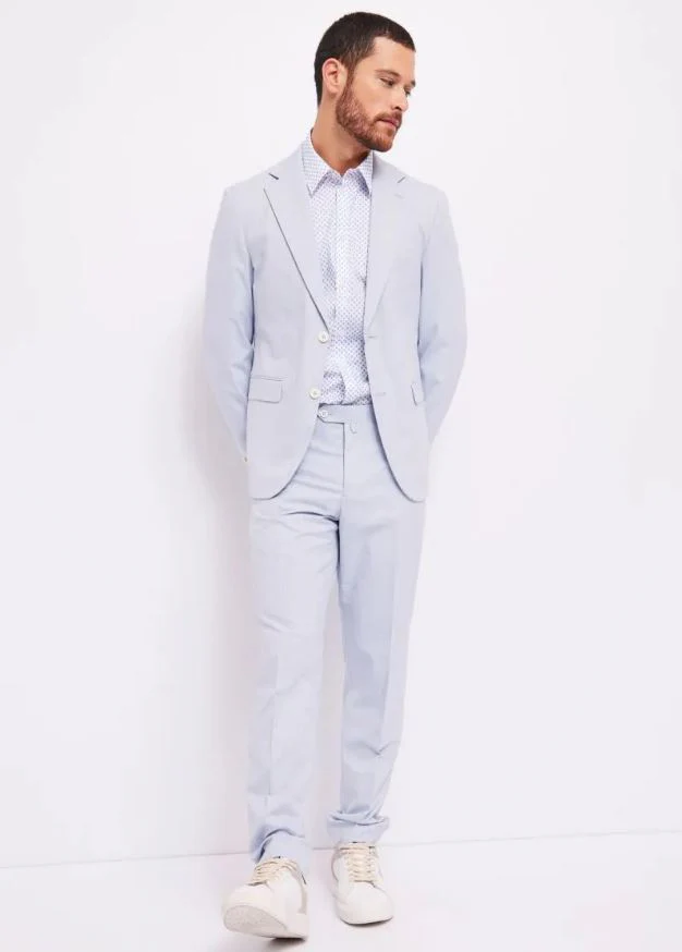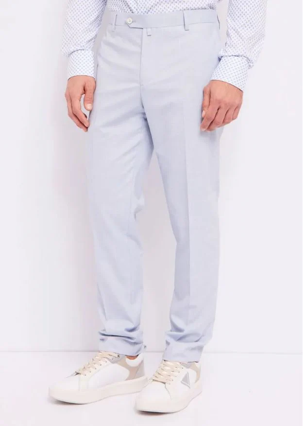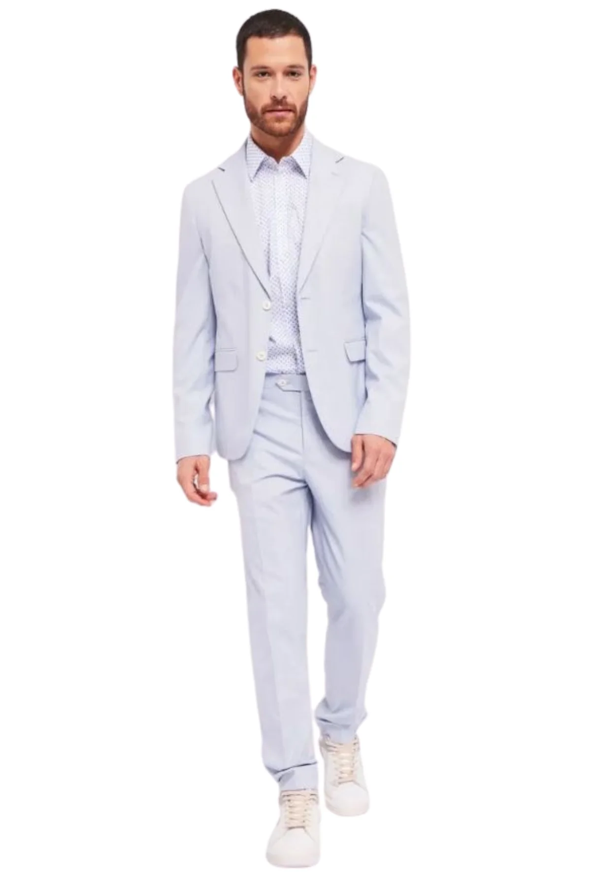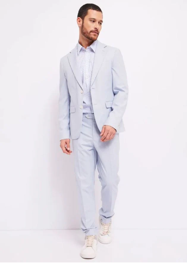 Completo effetto tessuto con giacca a due bottoni e pantalone taglio classico con vita normale, vestibilità slim.