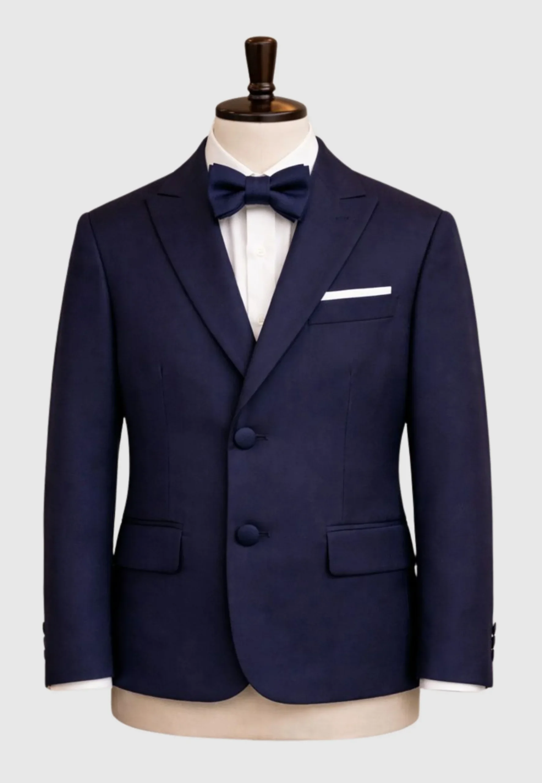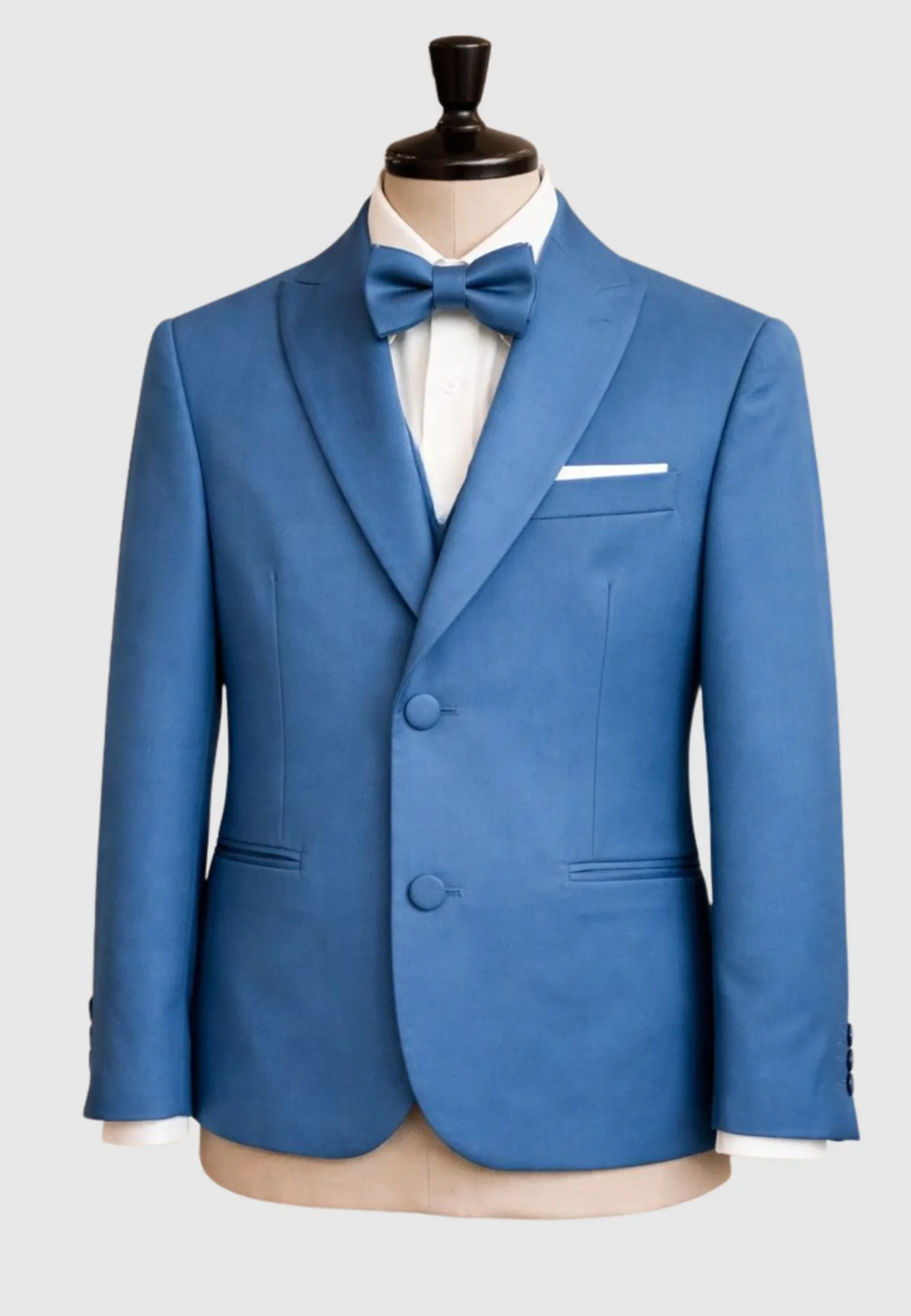 Completo tinta unita, bottoni foderati e giacca con collo a rever. Camicia classica. Pantalone taglio classico chiusura con zip e bottone, tasche a filo e elastici interni alla vita. Papillon abbinato.