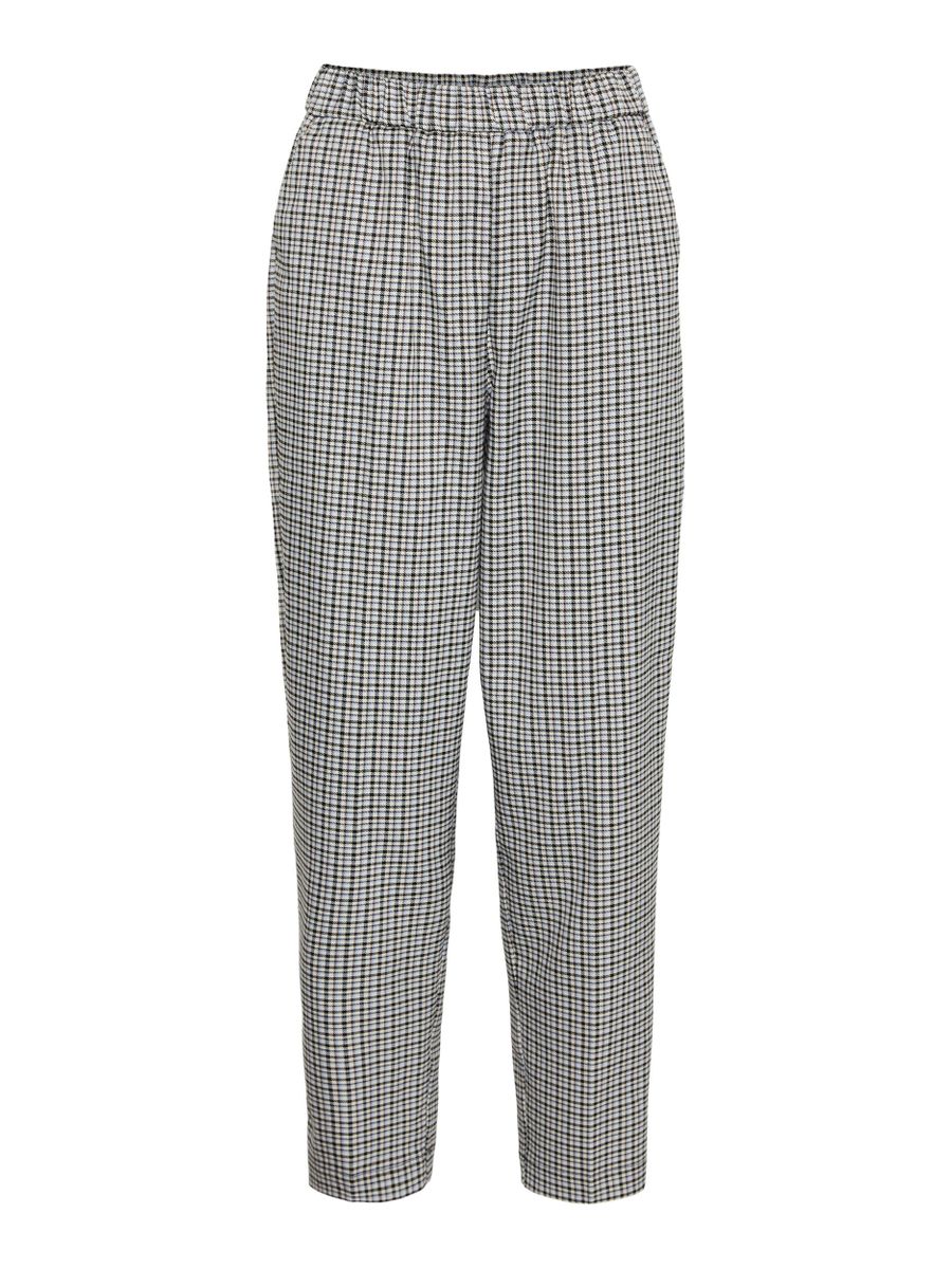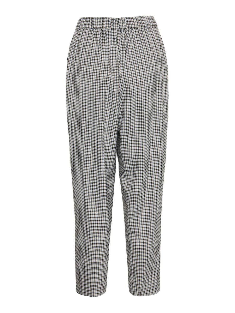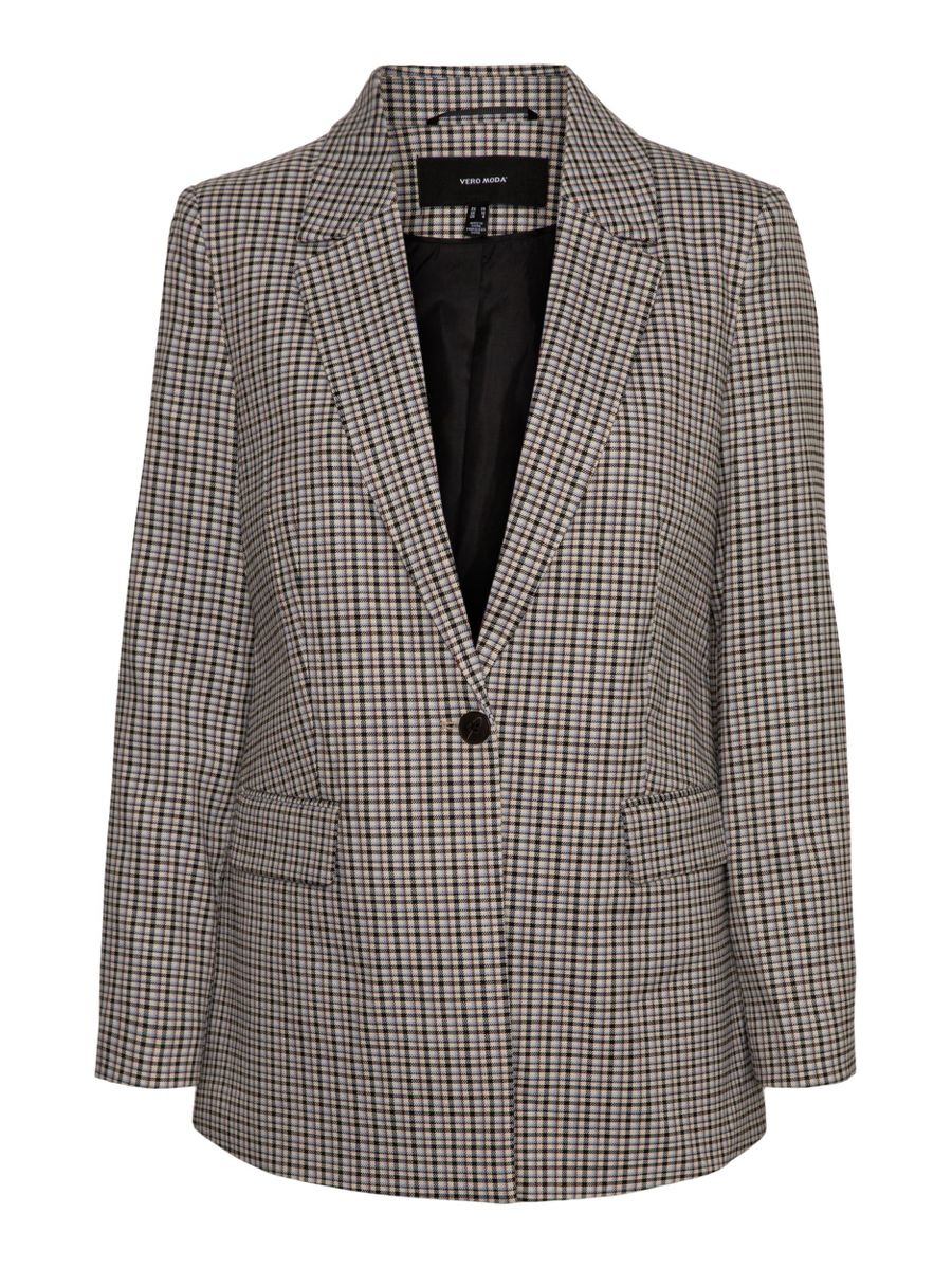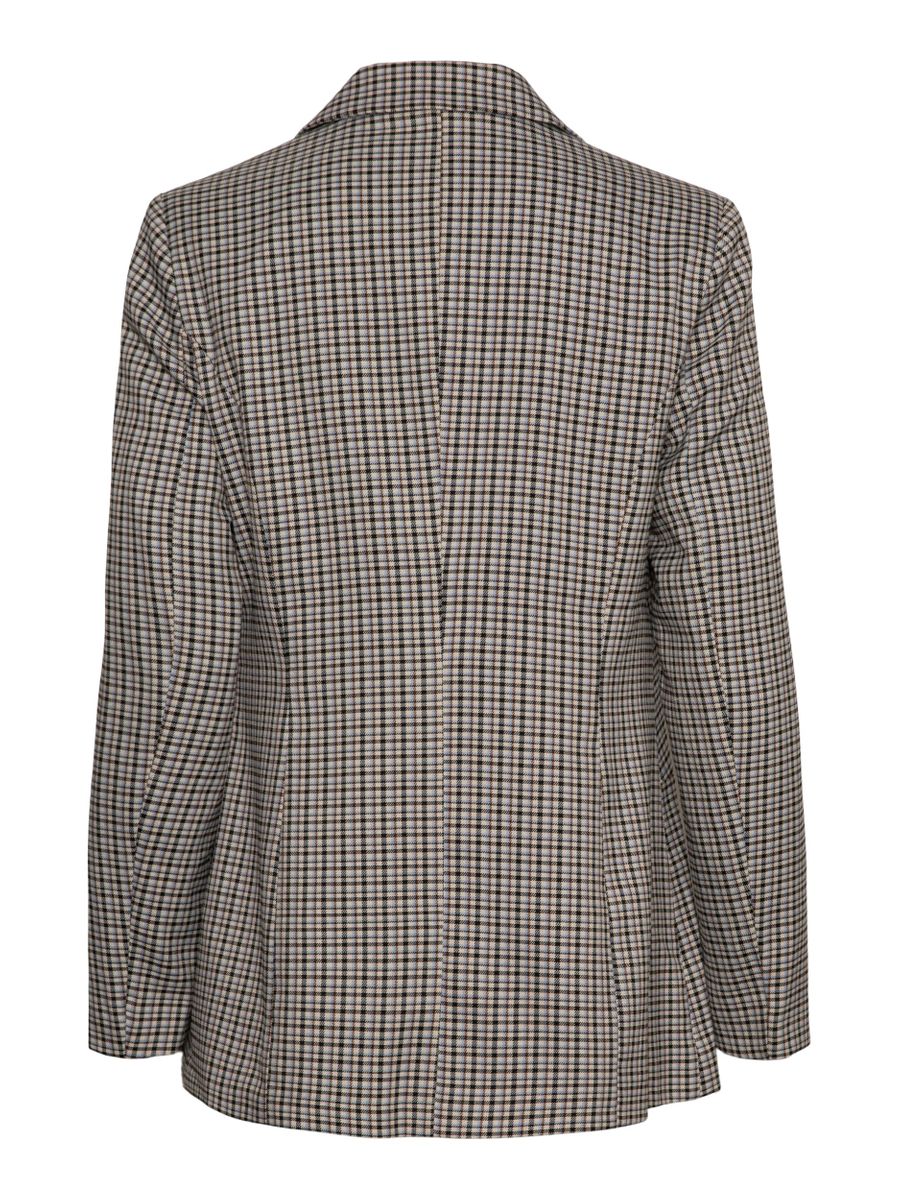 Completo con fantasia micro quadri multicolore, pantalone gamba stretta ed elastico in vita, giacca con rever a un bottone, avvitata lunga al bacino.