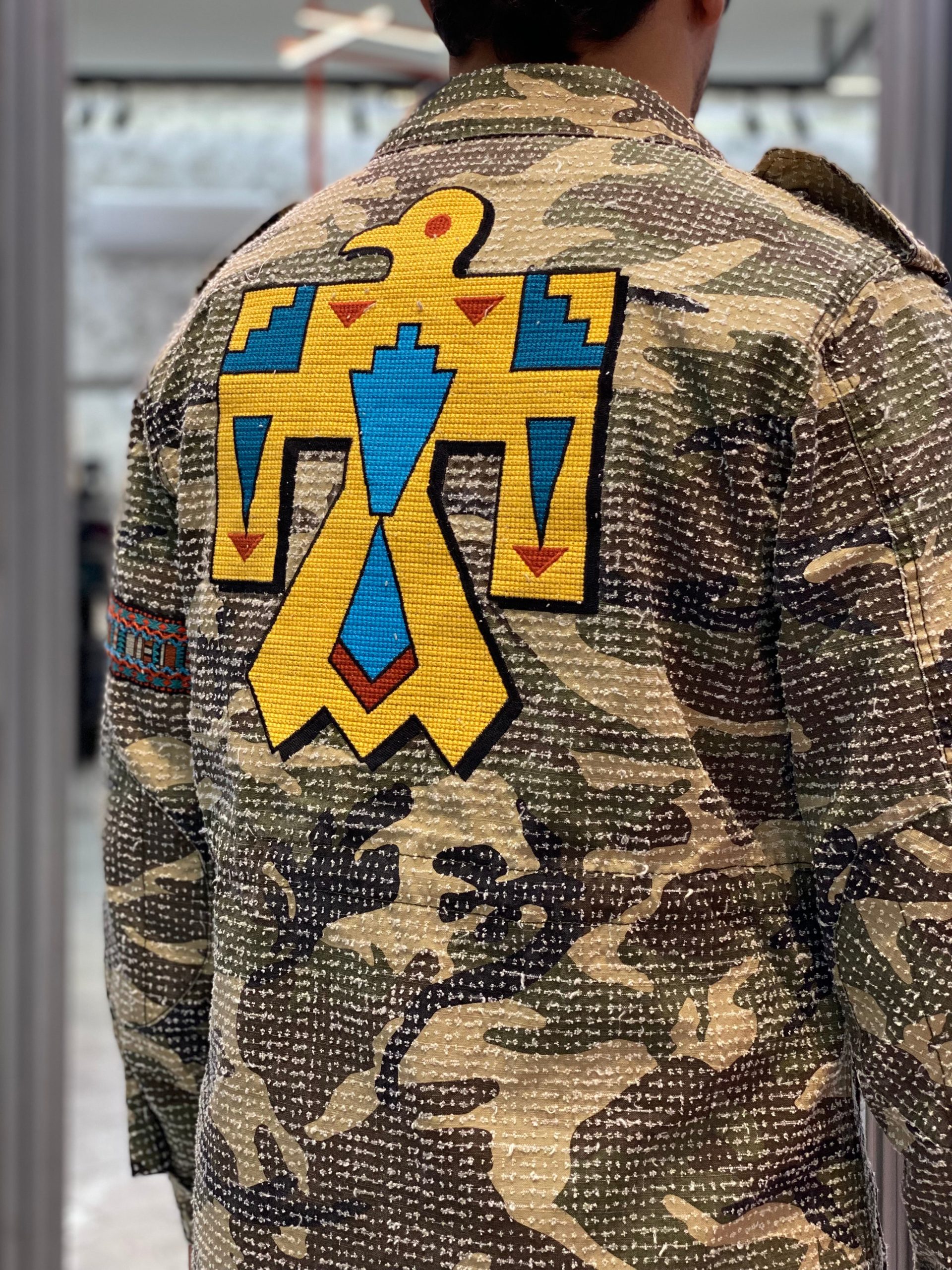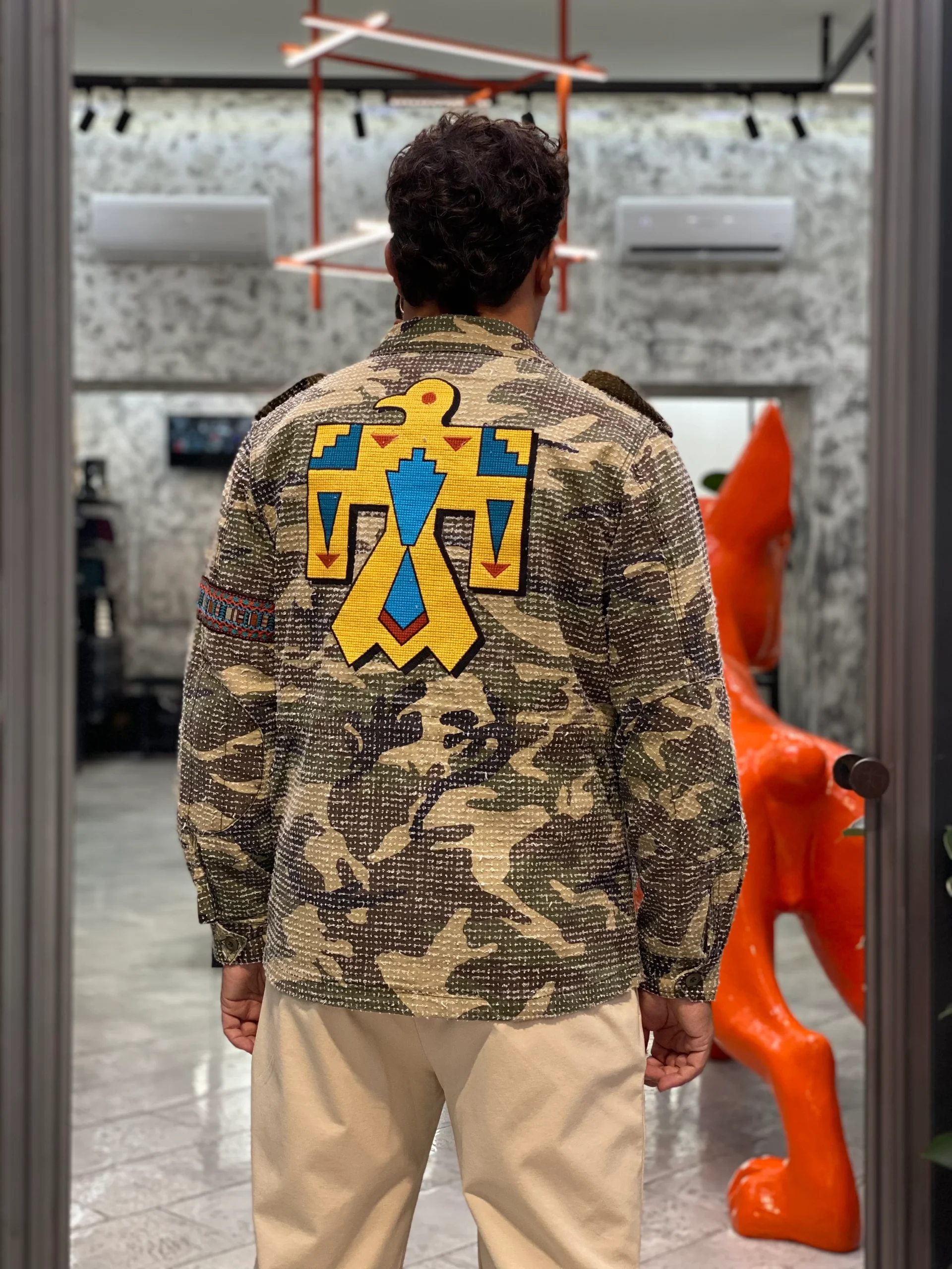 Giacca camouflage texturizzata a manica lunga con 4 trasche frontali in puro cotone.Abbottonatura centrale.Pendaglio decorativo con piume e perline sulla tasca.Bandana sulla spalla.Ricamo berna punto cuore e ricamo colorato braccio sinistro.Cinturini regolabili in vita.çunghezza media.Fondo dritto.