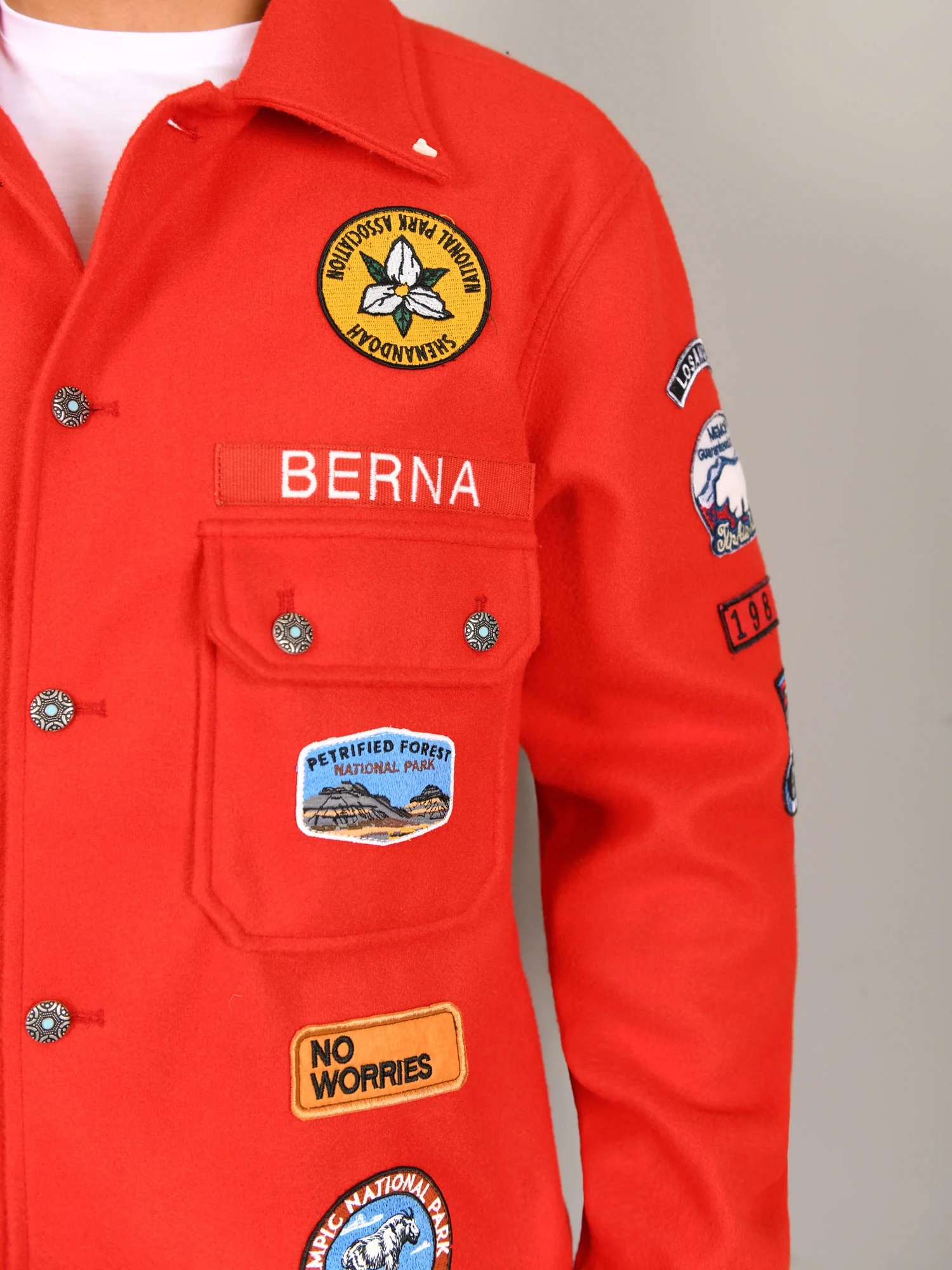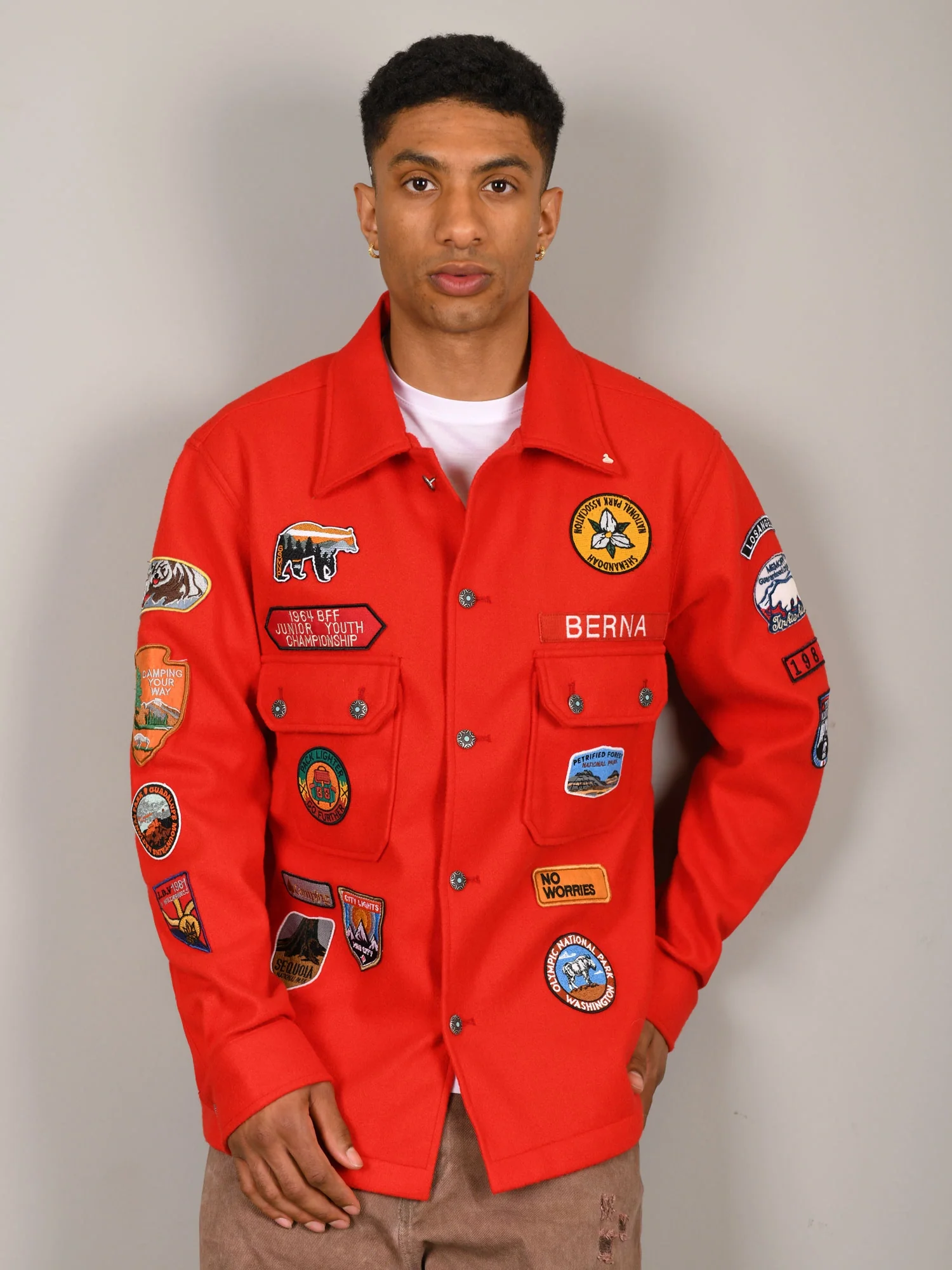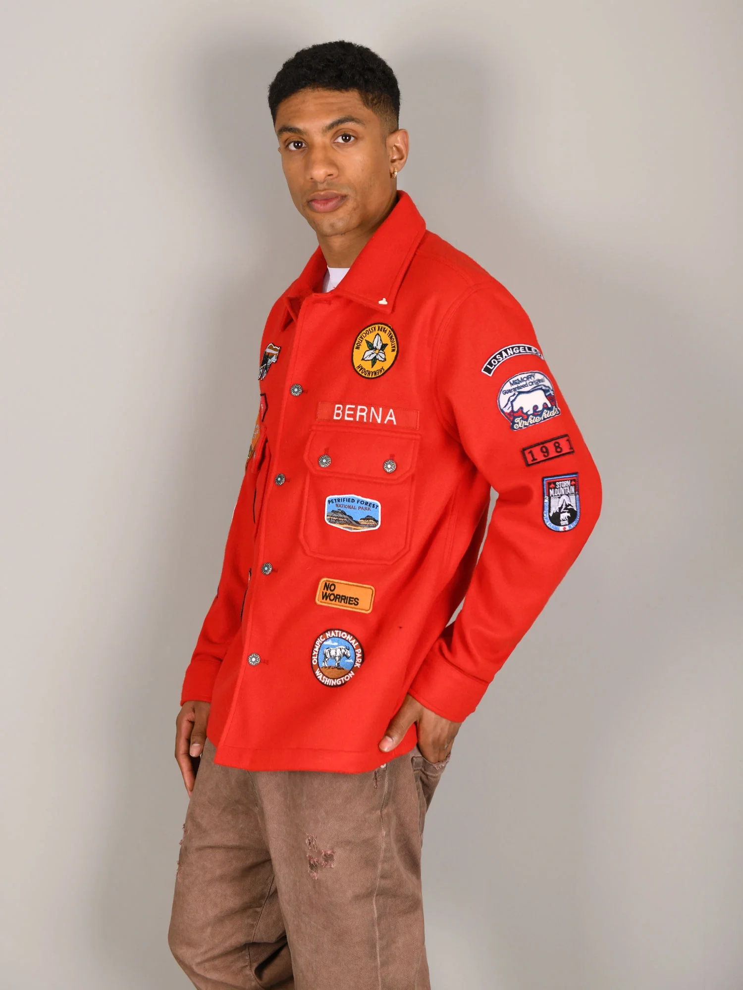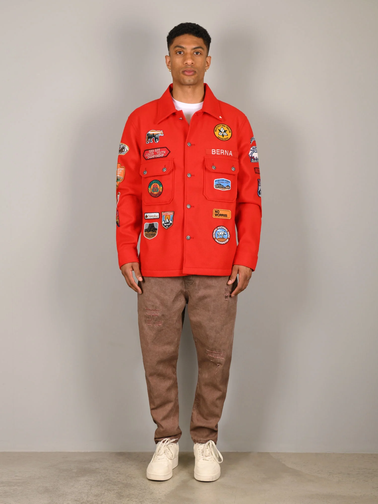 Overshirt Boy Scout in fibre rigenerate con colletto classico e patch applicate.