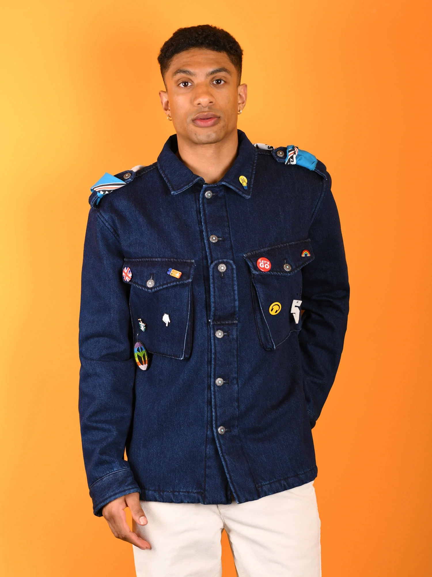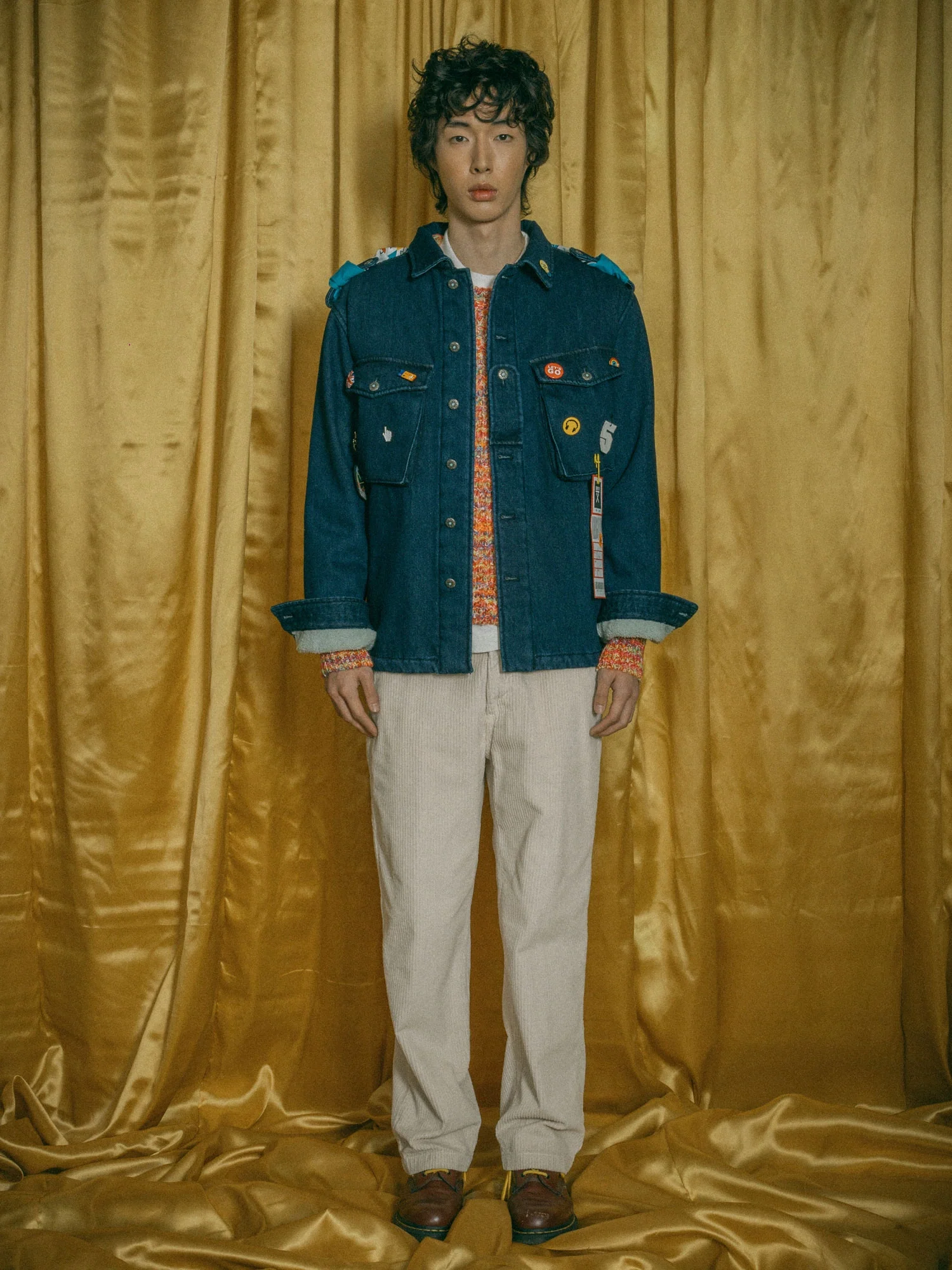 Overshirt denim in puro cotone con fodera teddy, colletto classico, spille applicate e controspallina ton sur ton abbottonata.Foulard applicato nel retro ad altezza spalle.Chiusura con bottoni centrali decorati e maxi tasche anteriori a vista.Maniche lunghe con polsino abbottonato.Fondo dritto.Il modello è alto 182 cm ed indossa una taglia L