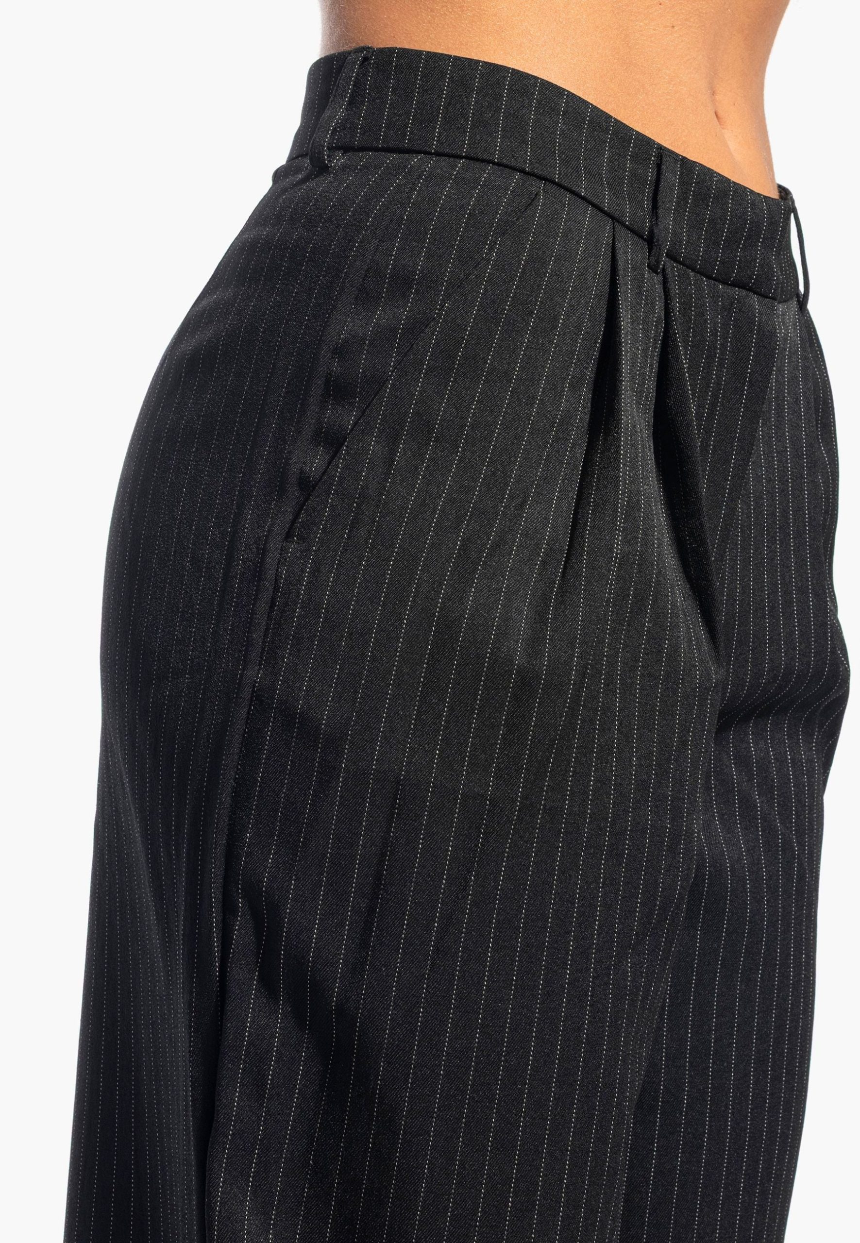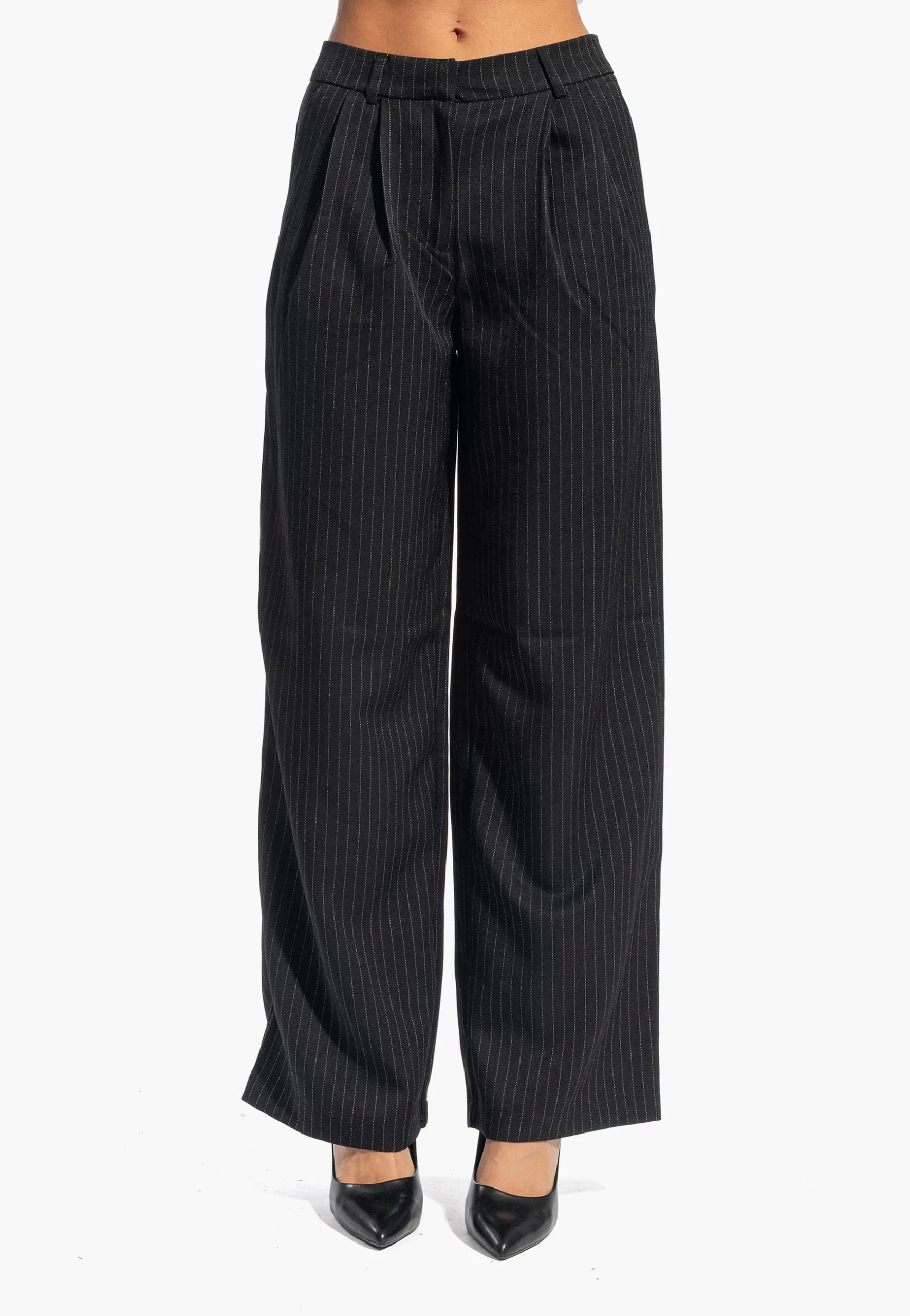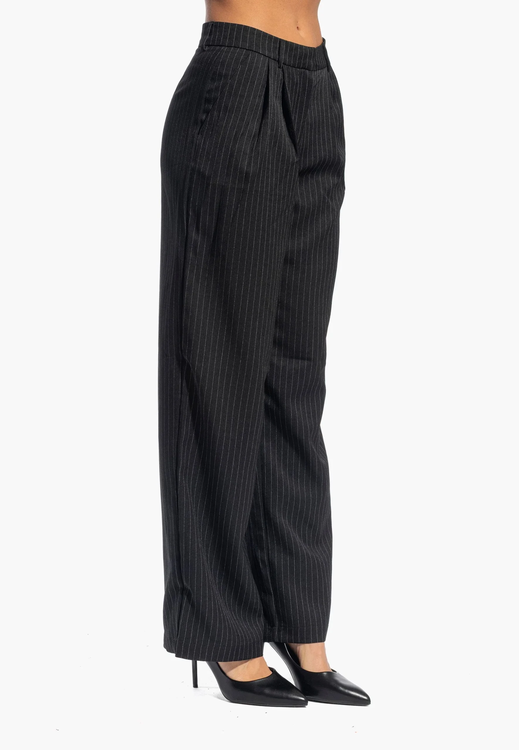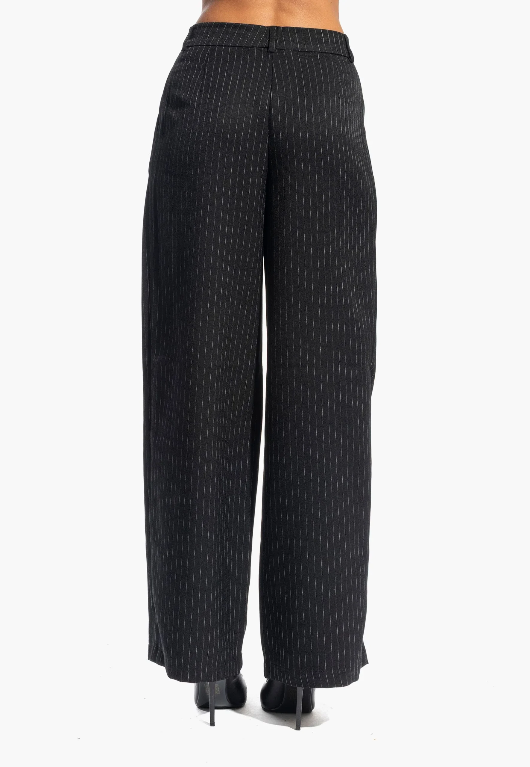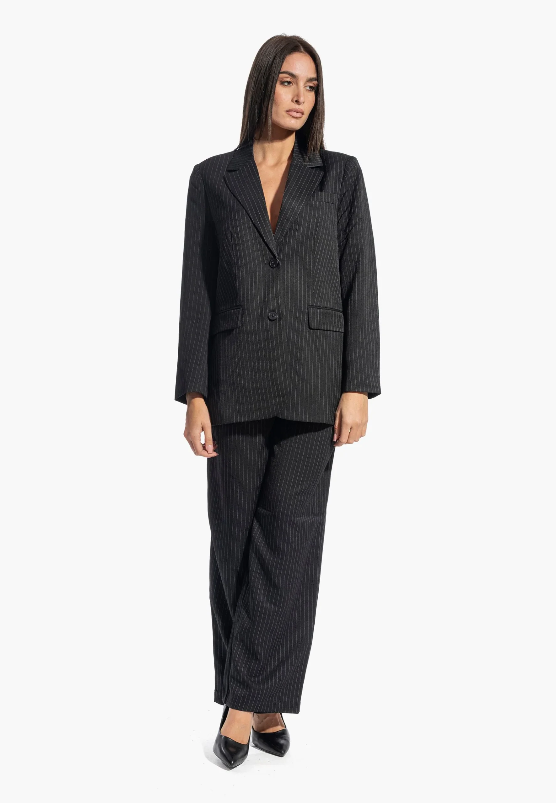 Pantaloni palazzo dalla linea essenziale e versatile, ideali per chi ricerca eleganza senza compromessi. Il taglio dritto e la vita alta valorizzano la silhouette, mentre il tessuto gessato conferisce carattere e raffinatezza. Perfetti per passare senza sforzo da un look casual con sneaker a un outfit serale con tacchi. Dotati di chiusura lampo, dettaglio plissettato e passanti per cintura, rappresentano un investimento sartoriale che si adatta a molteplici occasioni.