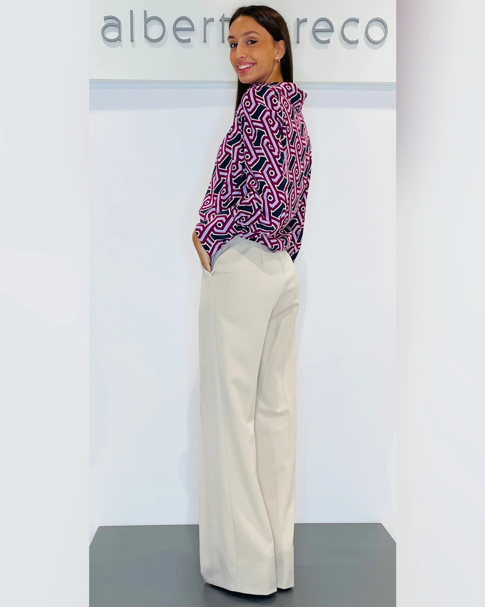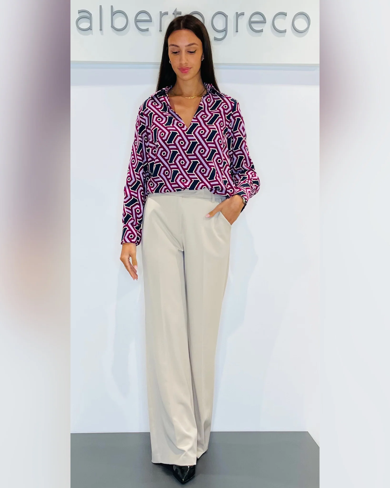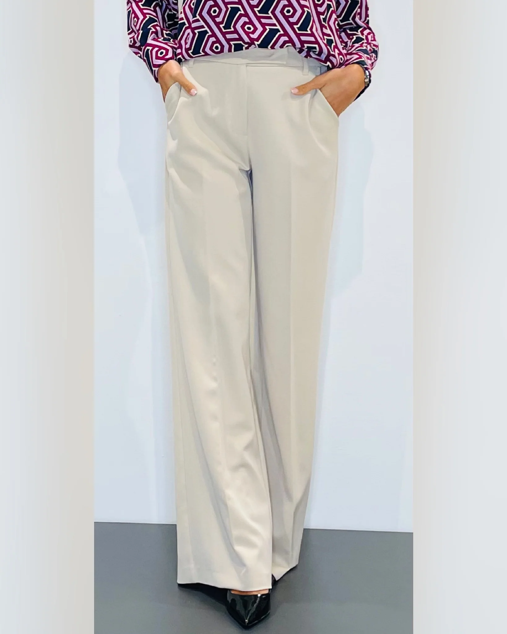 Pantaloni a palazzoVestibilità regolareCintura con passanti, tasca alla franceseChiusura con zip e bottone nel centro davanti Lavare a mano 30°Tessuto 70%PL 25%VI 5%EAMade in Italy