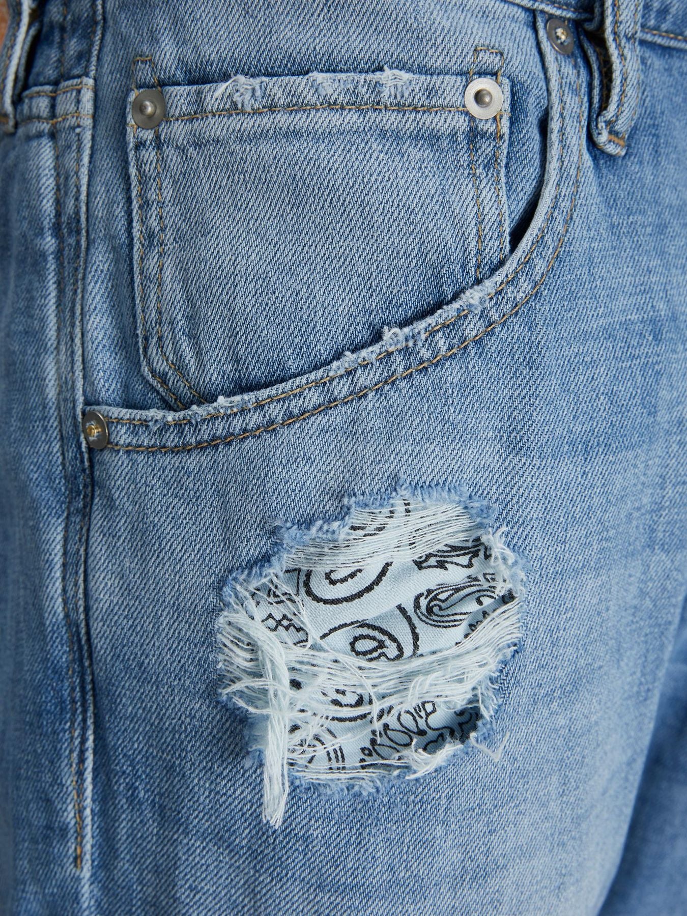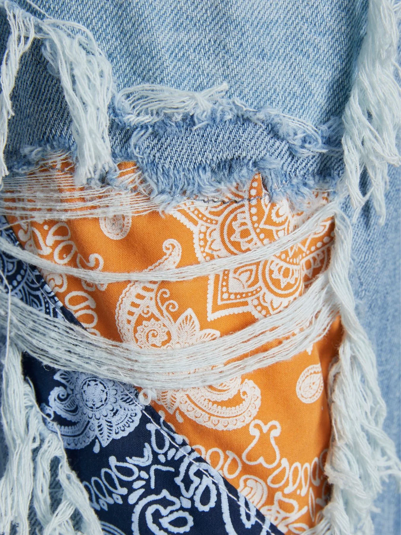 Jeans cropped, vita alta, in tessuto non elasticizzato con rotture e toppe colorate.