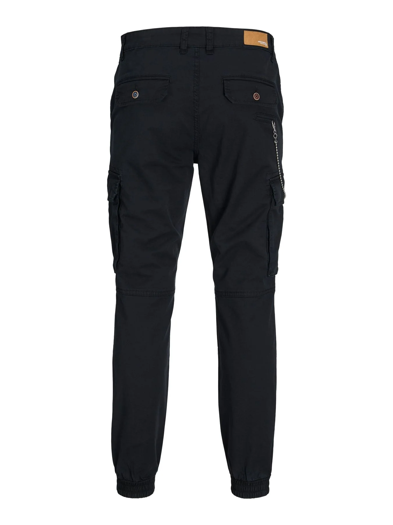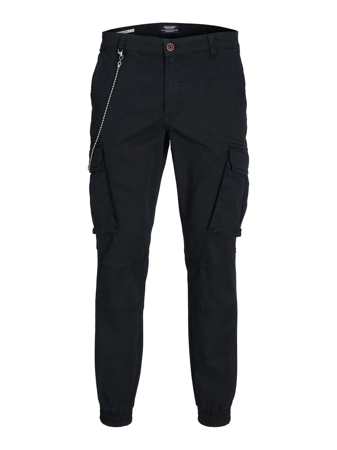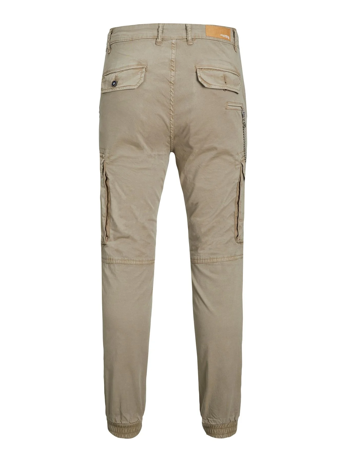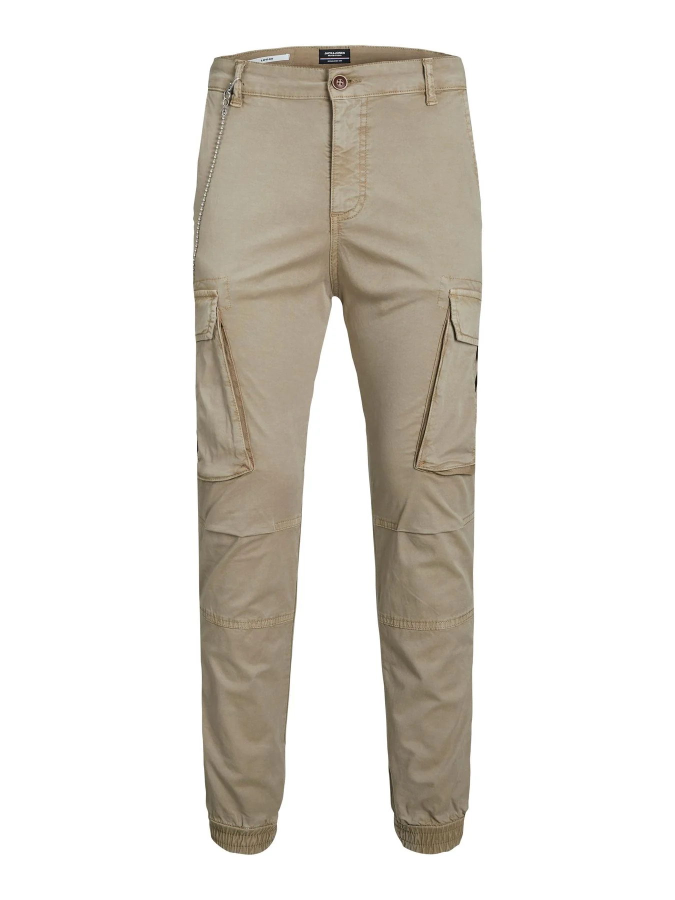 Pantalone cargo tasconato, vita regolare con elastici alle caviglie.