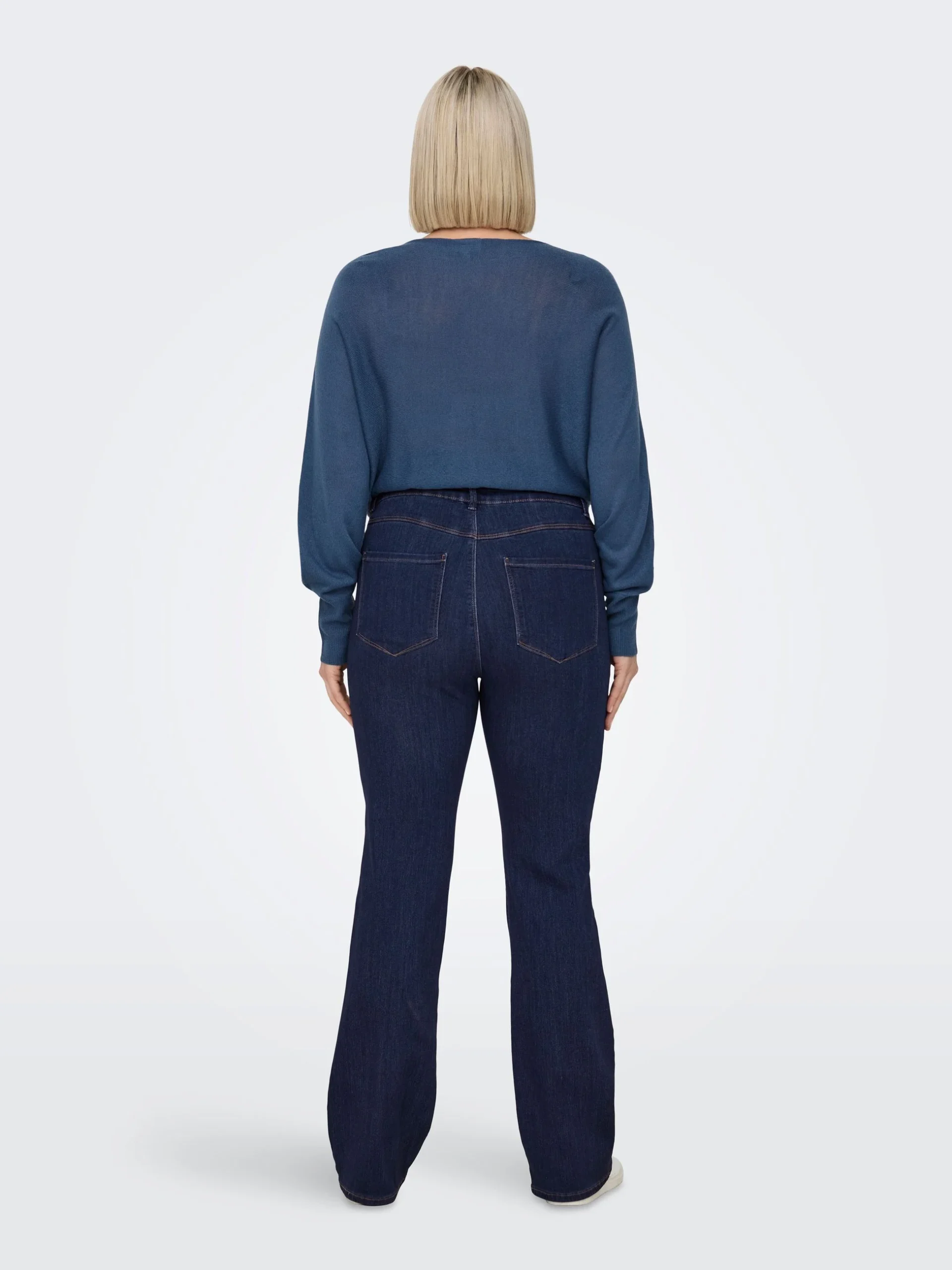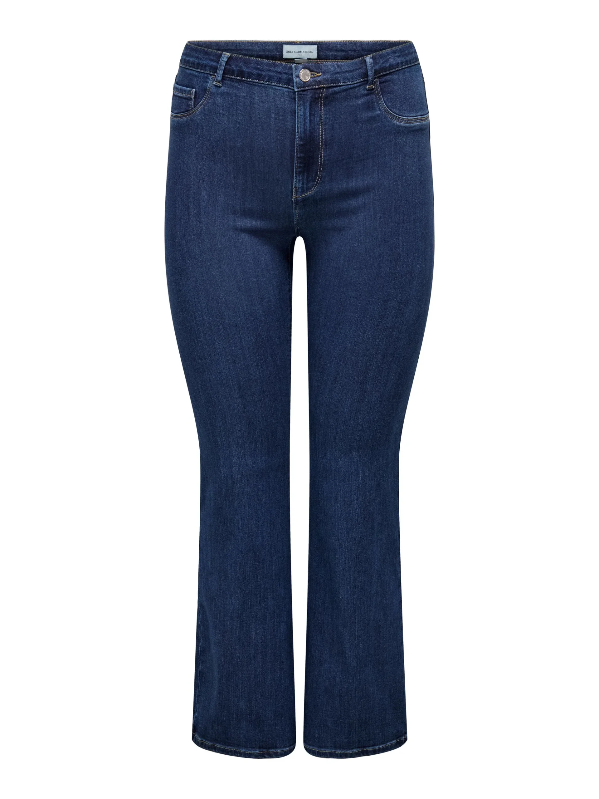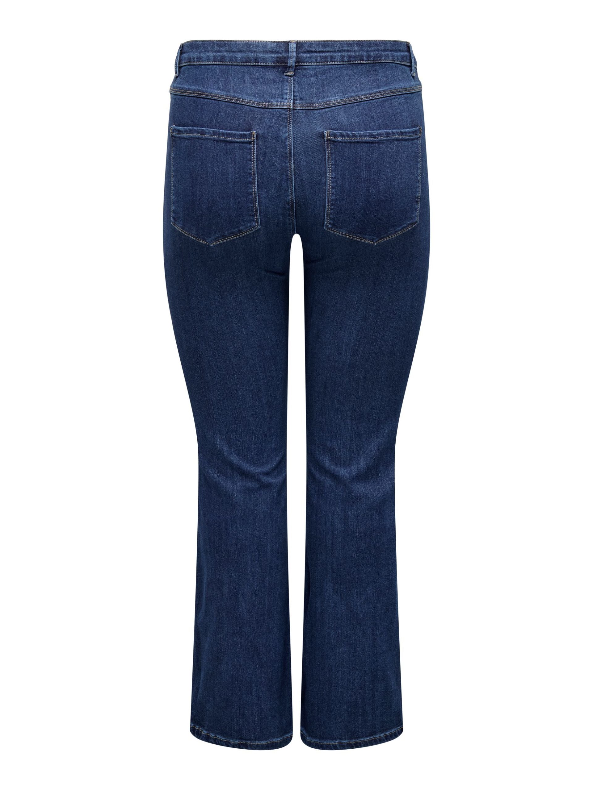 Jeans flared vita media in cotone elasticizzato, chiusura con zip e bottone.